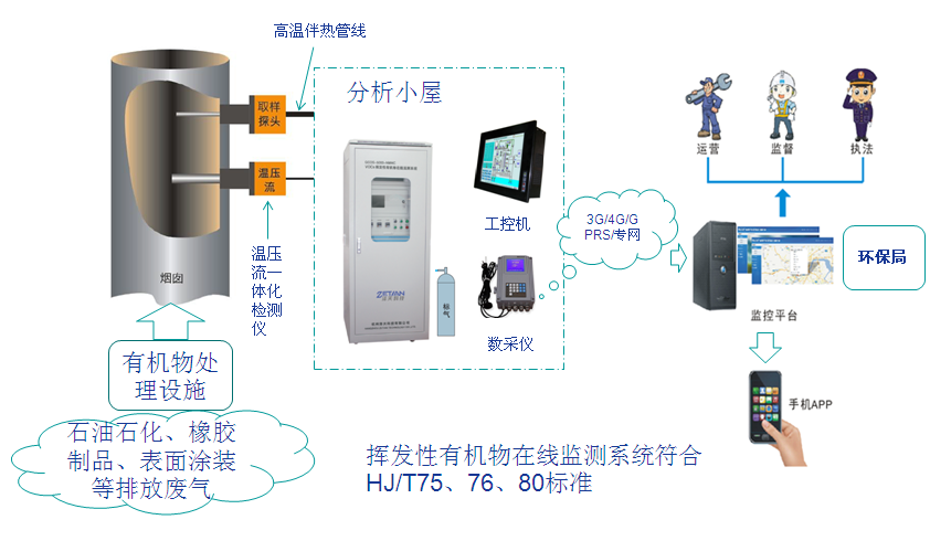 揮發(fā)性有機物煙氣排放連續(xù)監(jiān)測系統(tǒng)采用先進的全程伴熱預處理+在線色譜技術+火焰離子檢測法(FID),主要應用于對各種工業(yè)污染源排放有機物的實時監(jiān)測,本系列在線氣相色譜分析儀采用國際先進技術,性能穩(wěn)定可靠,自動化程度高,檢測范圍寬,能夠測量VOCS、總烴(THC)、非甲烷總烴(NMHC)、苯及苯系物等多項參數(shù),對VOCS的濃度和排放率進行連續(xù)、實時地跟蹤監(jiān)控,并將所有的監(jiān)測參數(shù)傳輸至工控機軟件和用戶DCS系統(tǒng),可通過數(shù)采儀與環(huán)保部門的數(shù)據(jù)系統(tǒng)通訊。系統(tǒng)設備放置在分析小屋內(nèi),操作和維護方便,具有現(xiàn)場數(shù)據(jù)實時傳送、遠程故障診斷等功能,實現(xiàn)了工作現(xiàn)場的無人值守。整套系統(tǒng)結構簡單,模塊化設計,穩(wěn)定性強,運行成本低。