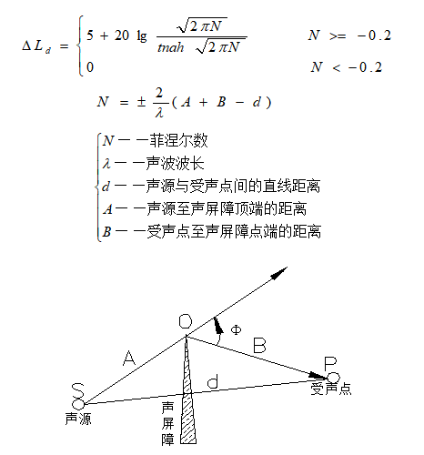 從上式中可以看出,聲屏障的繞射損失完全取決于菲涅爾指數(shù)N,即取決于聲源和受聲點(diǎn)之間的聲程差,聲程差A(yù)+B-d越大,λ聲波波長(zhǎng)越小(頻率越高)則聲屏障的繞射損失越大,也就是說(shuō)聲屏障的效果越好。