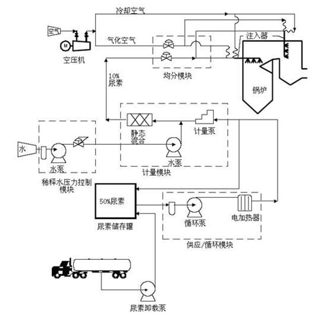 ? ? ? ?SNCR系統(tǒng)工藝流程示意。爐膛壁面上安裝有還原劑噴嘴,還原劑通過噴嘴噴入煙氣中,并與煙氣混合,反應后的煙氣流出鍋爐。整個系統(tǒng)由還原劑貯槽、還原劑噴入裝置和控制儀表所構(gòu)成。氨是以氣態(tài)形式噴入爐膛,而尿素是以液態(tài)形式噴入,兩者在設計和巧行上均有差別。尿素相對氨而言,貯存更方便且能更好地在煙氣中分散,對于大型鍋爐,尿素SNCR應用更普遍。當氨與NOx反應不完全時,未反應完全的NH3將從SNCR系統(tǒng)逸出。反應不完全的原因主要來自兩個方面:一種是因為反應的溫度低,影響了氨與NOx的反應;另一種可能是噴入的還原劑與煙氣混合不均勻。因此,還原劑噴射系統(tǒng)必須將還原劑噴入到鍋爐內(nèi)有效的部位,以保證氨與NOx的混合均勻。