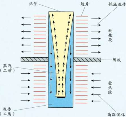 熱管工作原理:典型的重力熱管如圖所示,在密閉的管內(nèi)先抽成真空,在此狀態(tài)下充入適量工質(zhì),在熱管的下端加熱,工質(zhì)吸收熱量汽化為蒸汽,在微小的壓差下,上升到熱管上端,并向外界放出熱量,凝結(jié)為液體。冷凝液在重力的作用下,沿熱管內(nèi)壁返回到受熱段,并再次受熱汽化,如此循環(huán)往復,連續(xù)不斷的將熱量由一端傳向另一端